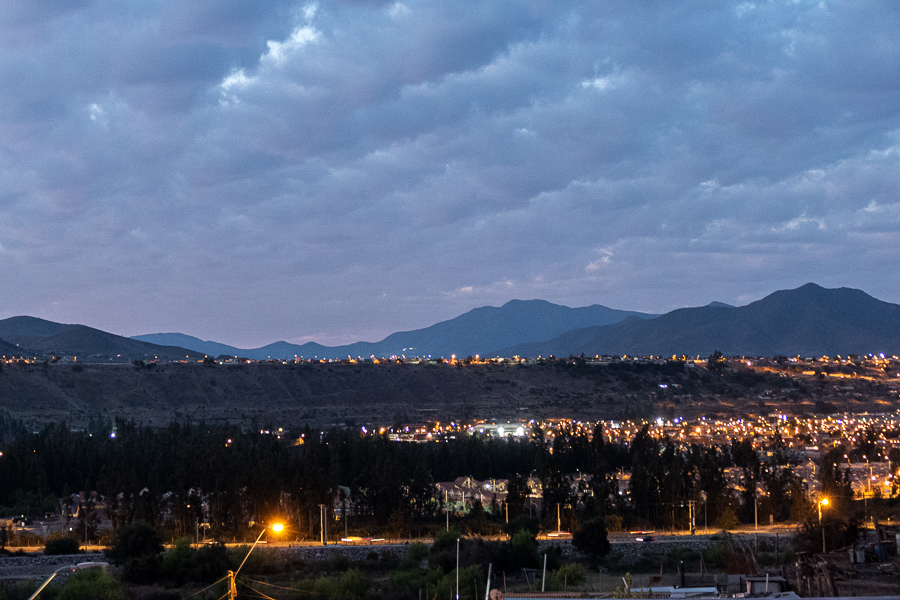 Die Villa ist im sizilianischen Stil erbaut, was uns nicht verwundert, als er erzählt, er sei Sizilianer. Seine chilenische Frau sei der Grund dafür, dass es ihn hierher verschlagen hat. Nachdem er uns unsere Zimmer gezeigt hat, verschwindet er wieder. Es ist eben noch Vorsaison, wir sind die einzigen Gäste in der Villa. Obwohl er die Heizung aktiviert hat, kommt aus den Duschen nur kaltes Wasser, aber wir werden es überleben. Von der Veranda hat man einen schönen Blick auf das nächtliche Ovalle, im Hintergrund die Ausläufer der Andenkette.